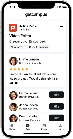 Message students directly, ask questions, and hire the best fit, all within the getcampus platform.
